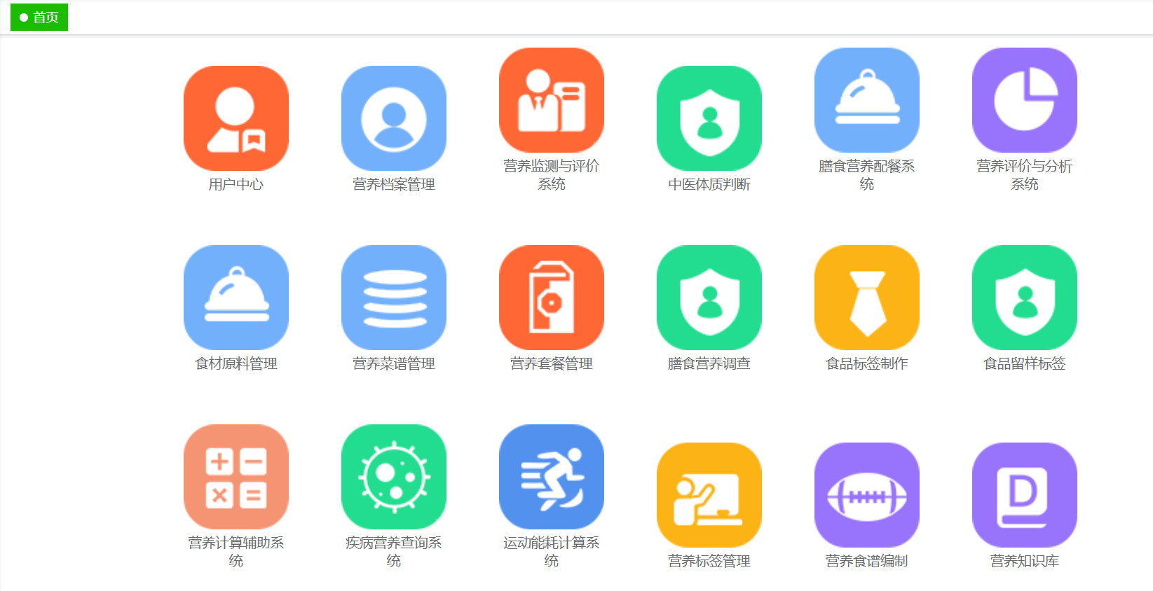 营养评价 营养配餐 营养分析 营养报告 原料管理 菜谱管理 套餐管理 膳食调查 食品标签 留样标签制作 营养计算器 慢病营养查询 运动能耗计算